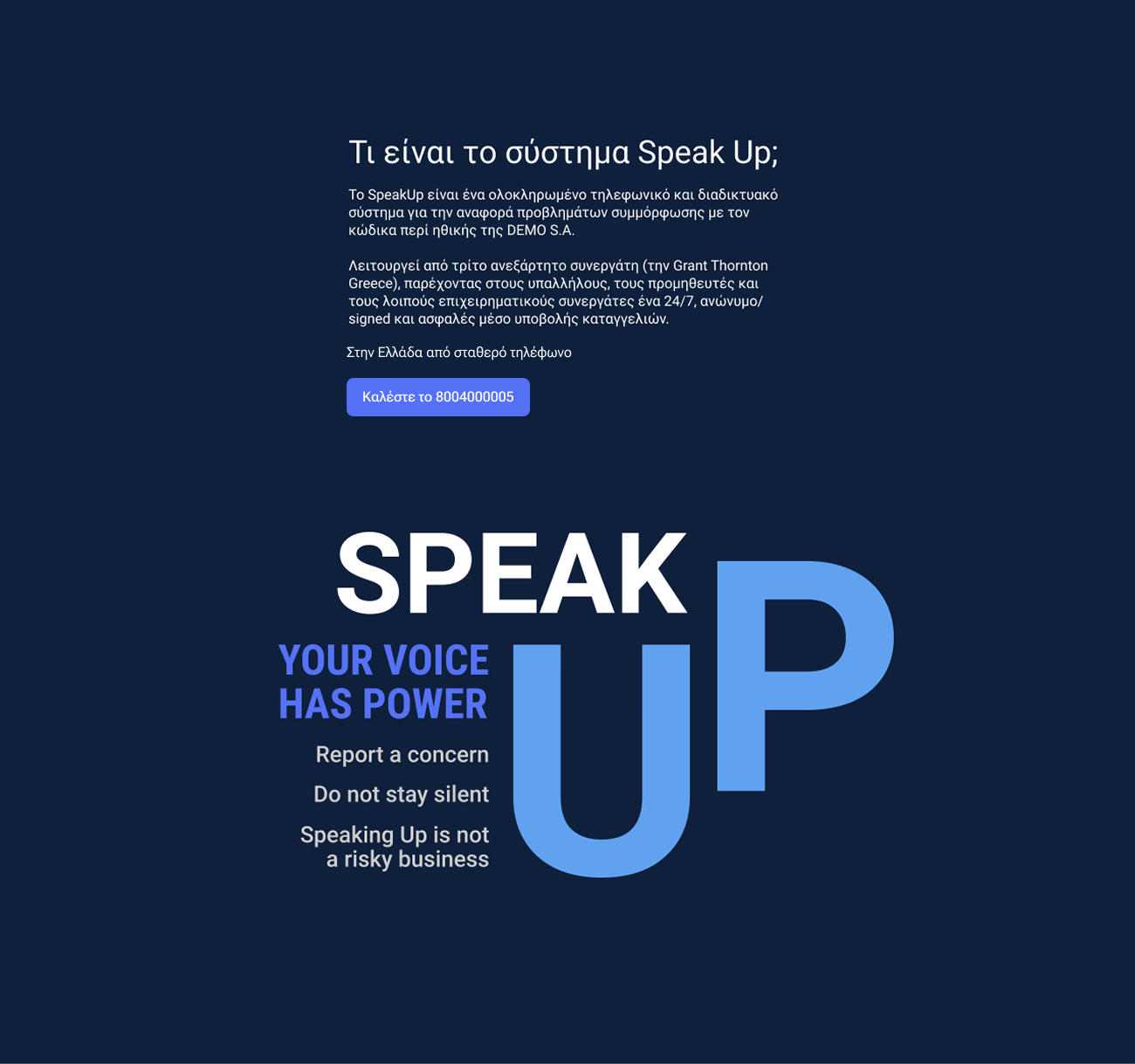 Η συγκεκριμένη υπηρεσία δεν είναι έκτακτης ανάγκης. Το σύστημα SpeakUp δεν πρέπει να χρησιμοποιείται για θέματα έκτακτης ανάγκης που απαιτούν άμεση ειδοποίηση.